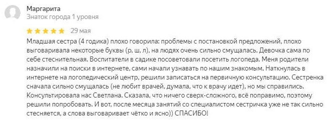 Младшая сестра (4 года) плохо говорила: проблемы с постановкой предложений, плохо выговаривала некоторые буквы (р, ш, л), на людях очень сильно смущалась. Девочка сама по себе стеснительная. Воспитатели в садике советовали посетить логопеда. Меня родители назначили на поиски в интернете, сами начали узнавать по нашим знакомым. Наткнулась в интернете на логопедический центр, решили записаться на первичную консультацию. Сестренка сначала сильно смущалась (не любит врачей, думала, что к врачу идет), но мы справились. Консультировала нас Светлана. Сказала, что ничего сверх-сложного, все поправимо, поэтому решили попробовать. И вот, после месяца занятий со специалистом сестричка уже не так сильно стесняется, а слова выговаривает четко и ясно)) СПАСИБО!